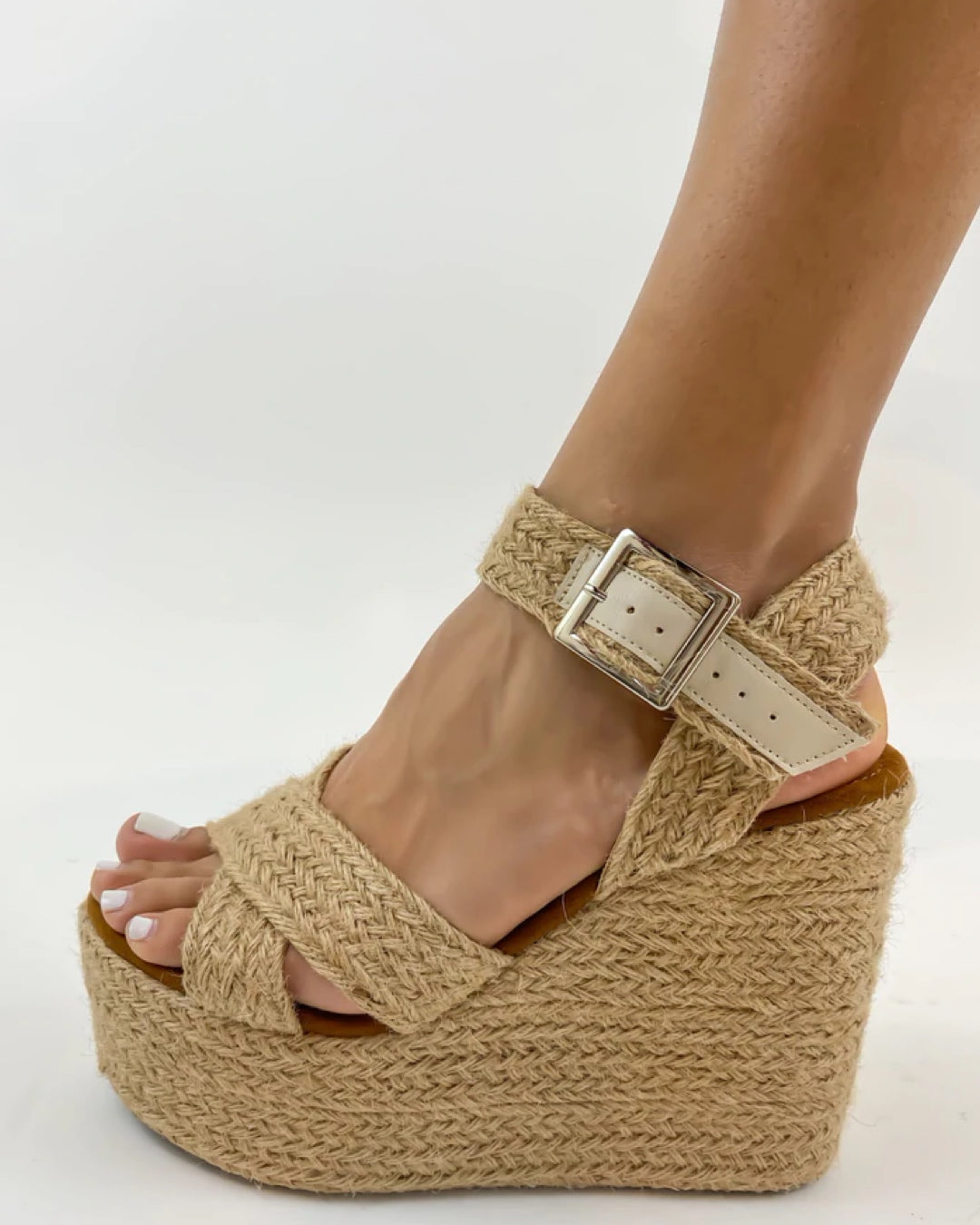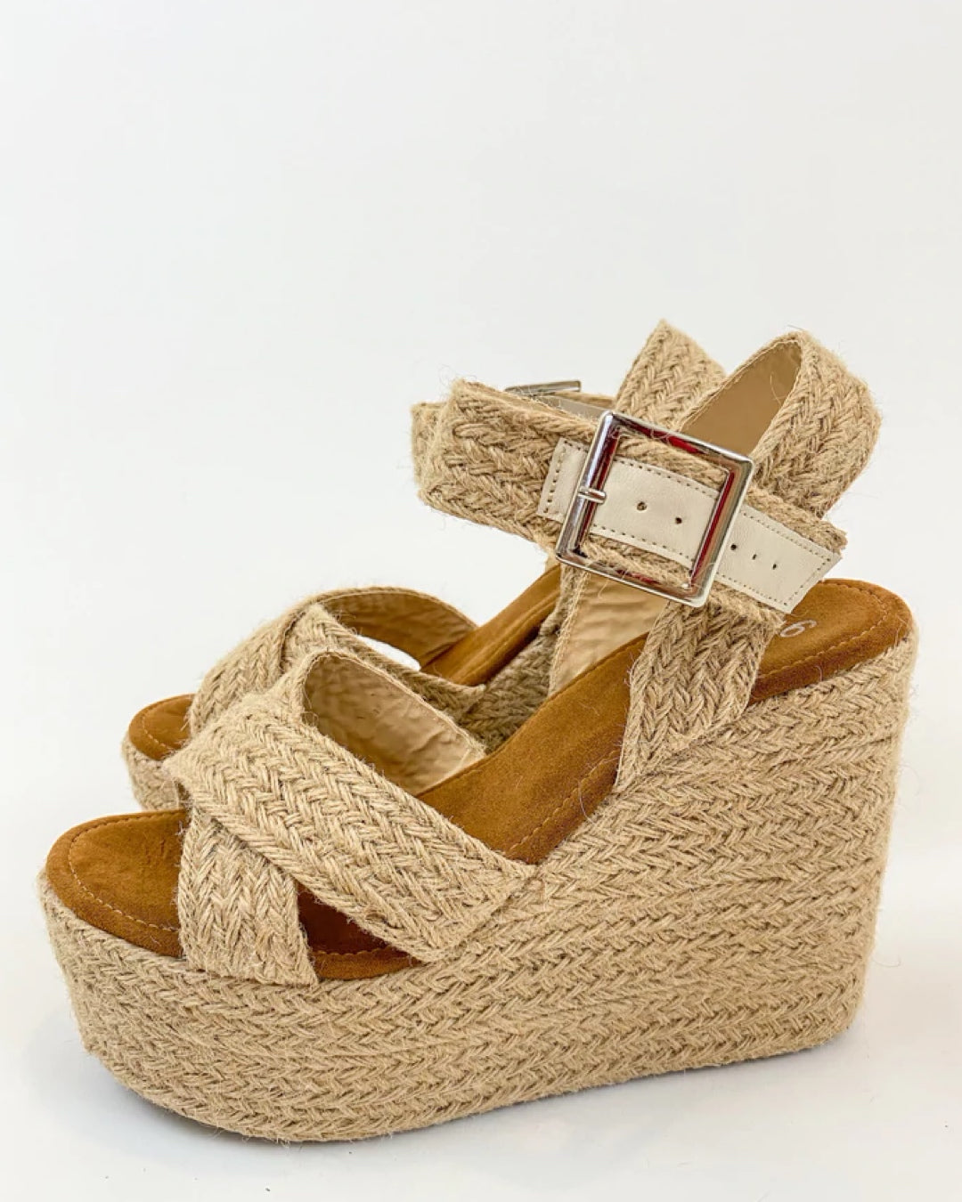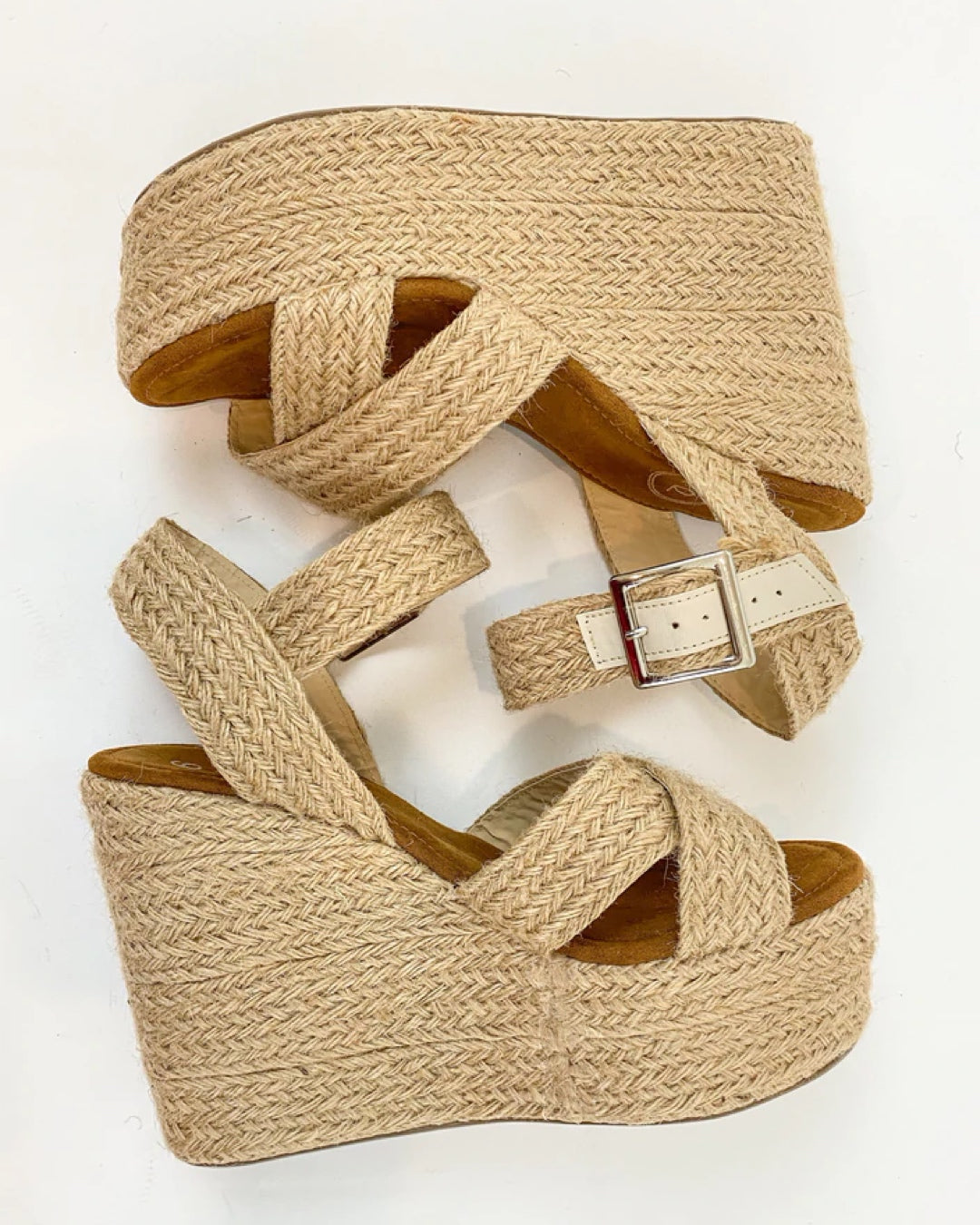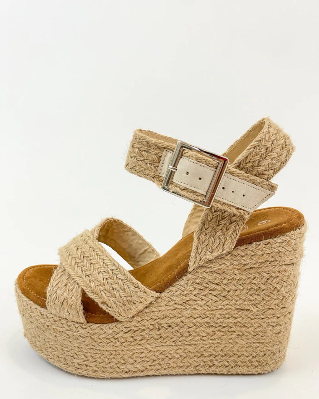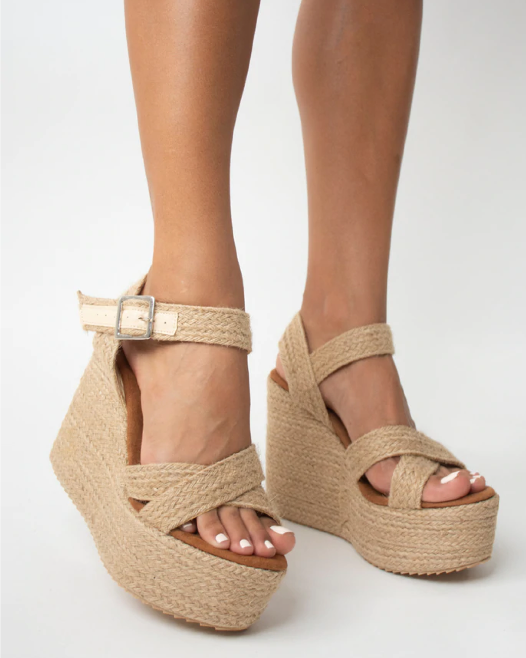 Plataforma forrada en su totalidad de yute natural, una fibra orgánica traída desde Tailandia, todo el proceso de elaboración, desde la fibra, hasta el armado del calzado es artesanal. La plantilla es de gamuza sintética de la mejor calidad, así mismo forramos los cortes del calzado de piel sintética suave y resistente para mayor comodidad en tus pisadas.