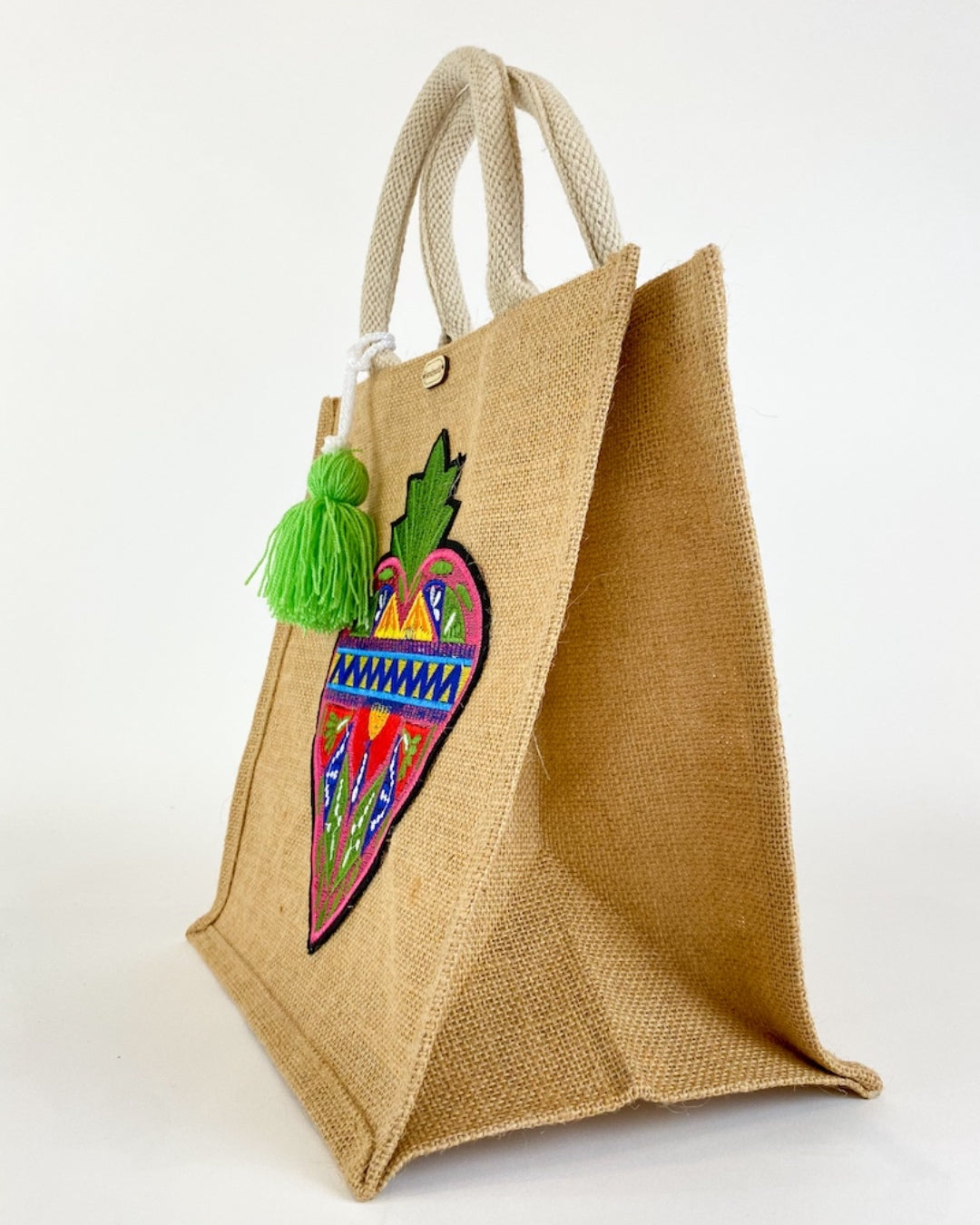 Bolsa de yute e hilo de algodón reciclado. Forramos el interior con un material impermeable para mayor resistencia.