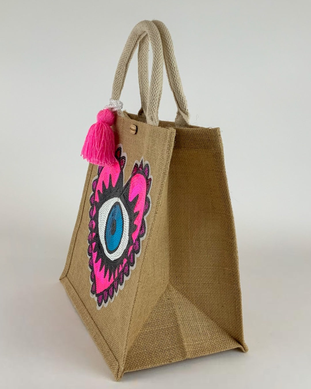 Bolsa de yute e hilo de algodón reciclado. Forramos el interior con un material impermeable para mayor resistencia.