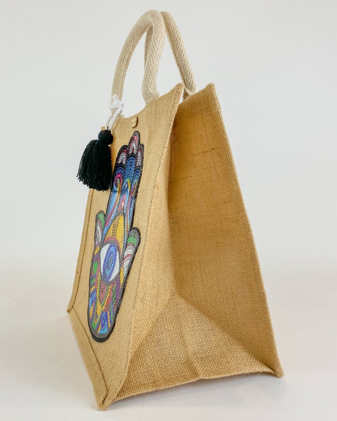 Bolsa de yute e hilo de algodón reciclado. Forramos el interior con un material impermeable para mayor resistencia.