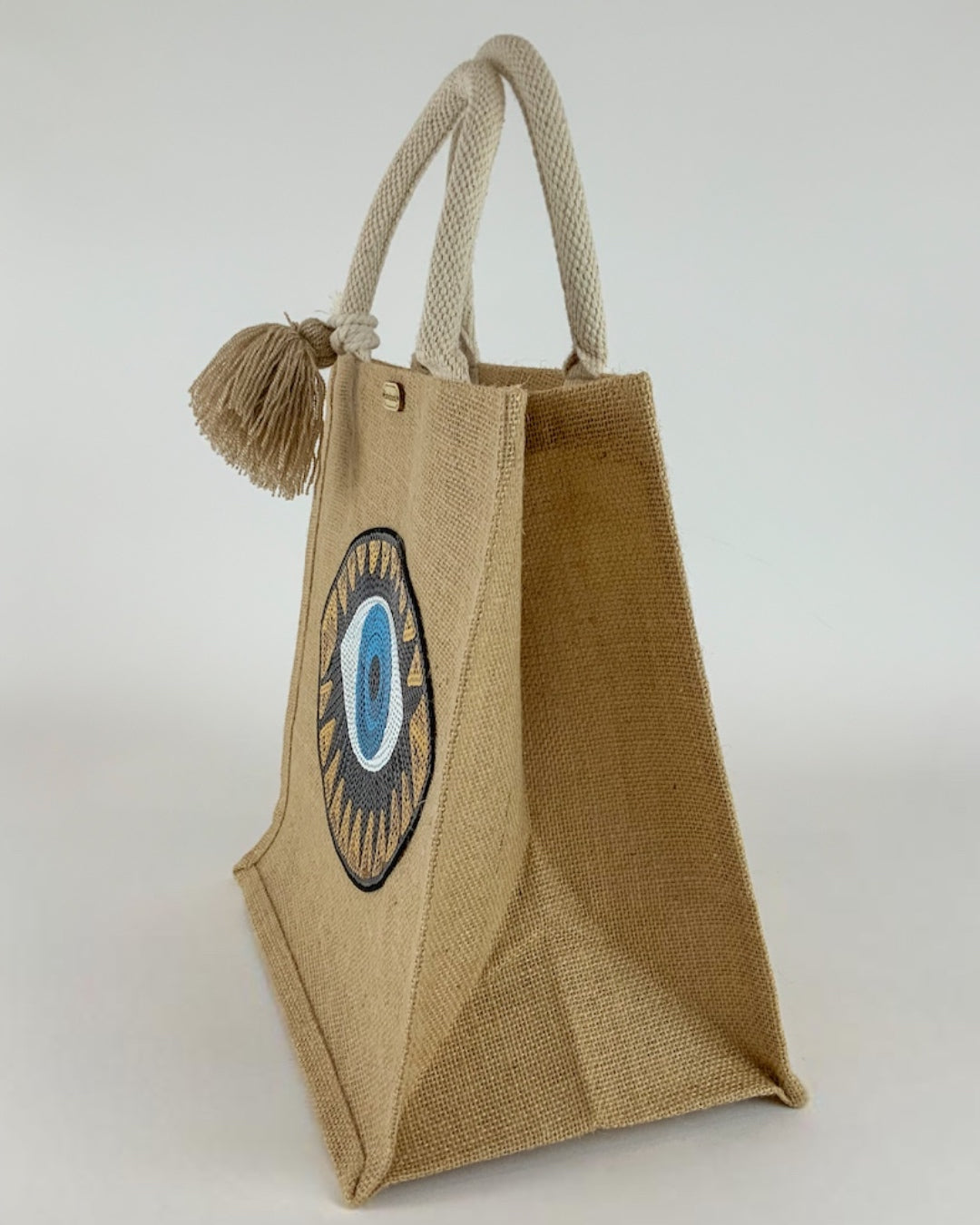 Bolsa de yute e hilo de algodón reciclado. Forramos el interior con un material impermeable para mayor resistencia.