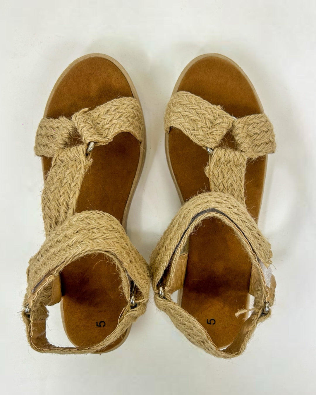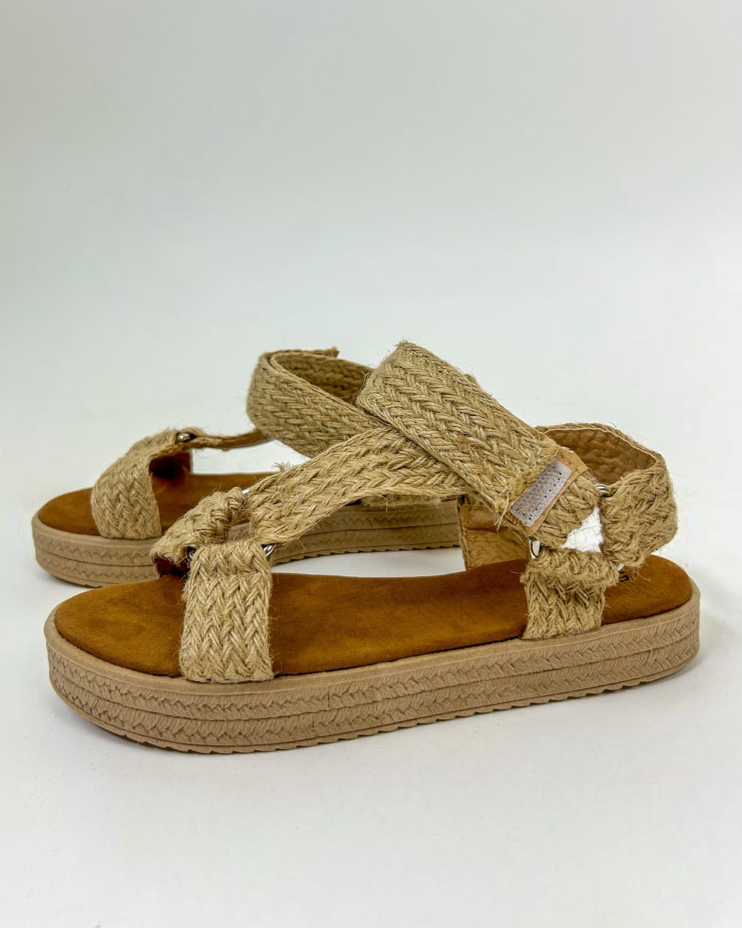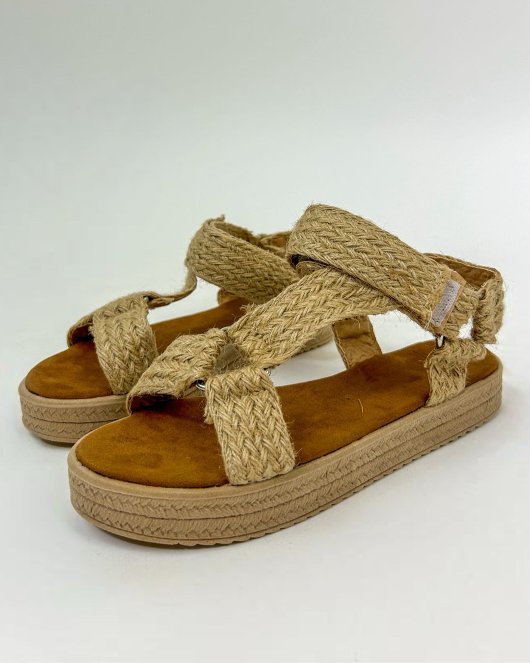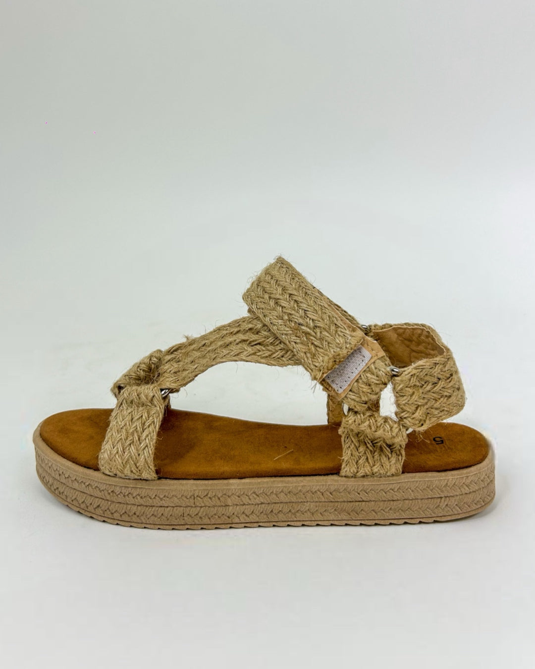 Plataforma forrada en su totalidad de yute natural, una fibra orgánica traída desde Tailandia, todo el proceso de elaboración, desde la fibra, hasta el armado del calzado es artesanal. La plantilla es de gamuza sintética de la mejor calidad, así mismo forramos los cortes del calzado de piel sintética suave y resistente para mayor comodidad en tus pisadas.