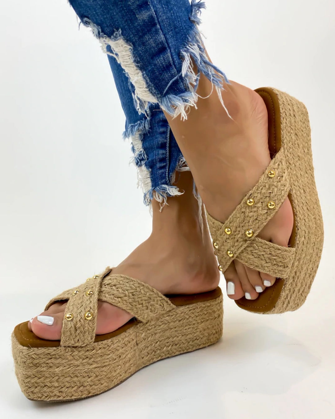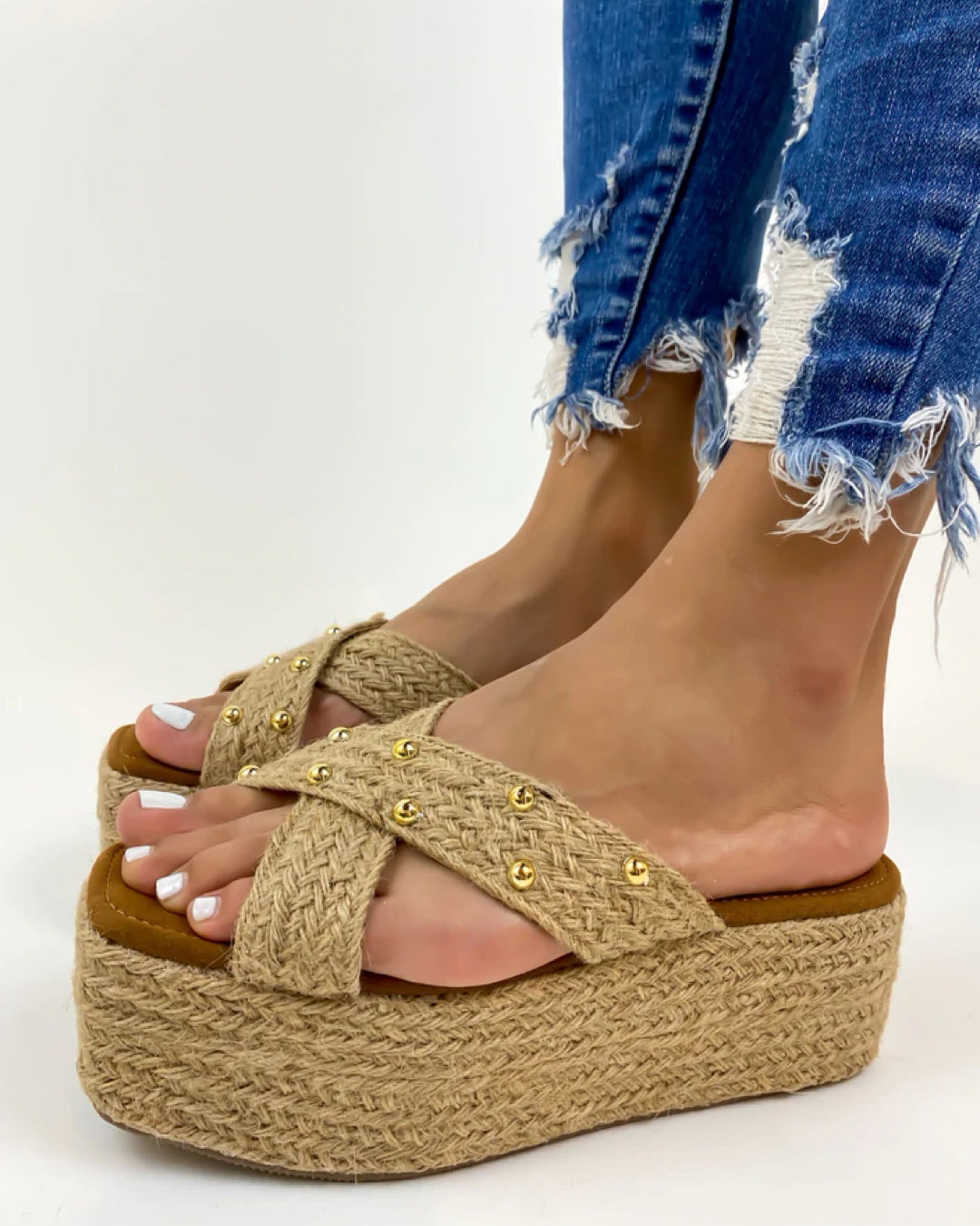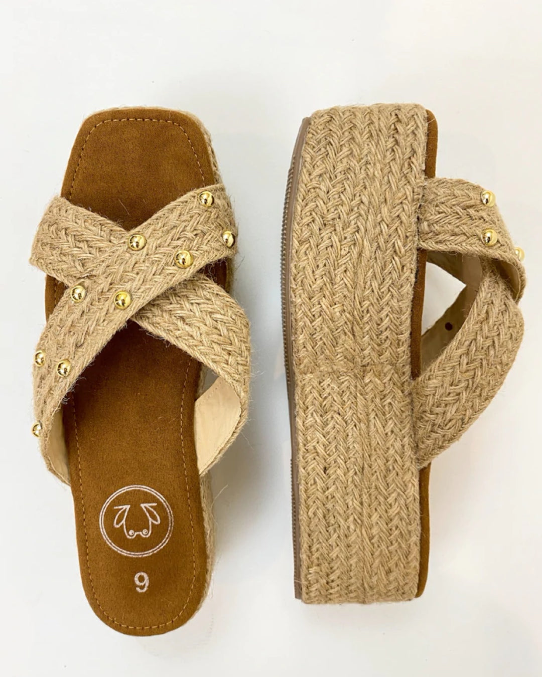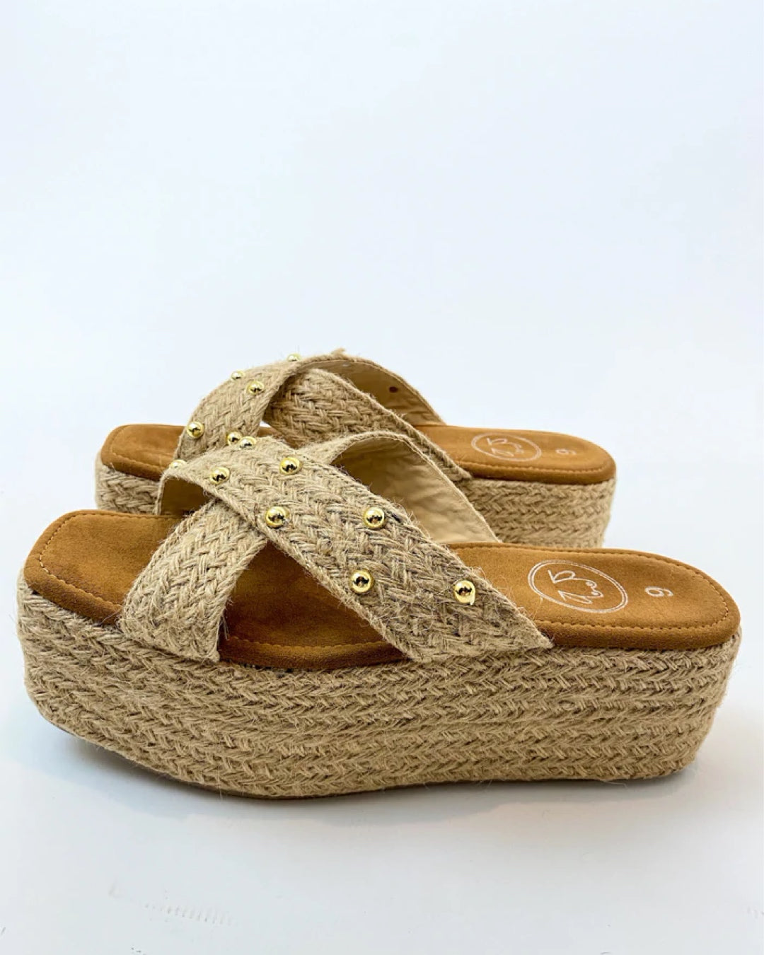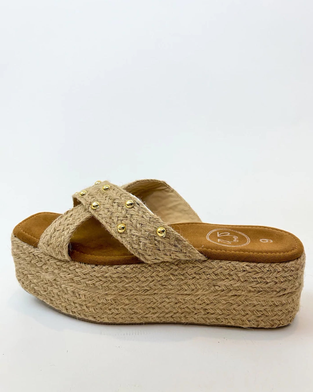 Plataforma forrada en su totalidad de yute natural, una fibra orgánica traída desde Tailandia, todo el proceso de elaboración, desde la fibra, hasta el armado del calzado es artesanal. La plantilla es de gamuza sintética de la mejor calidad, así mismo forramos los cortes del calzado de piel sintética suave y resistente para mayor comodidad en tus pisadas.