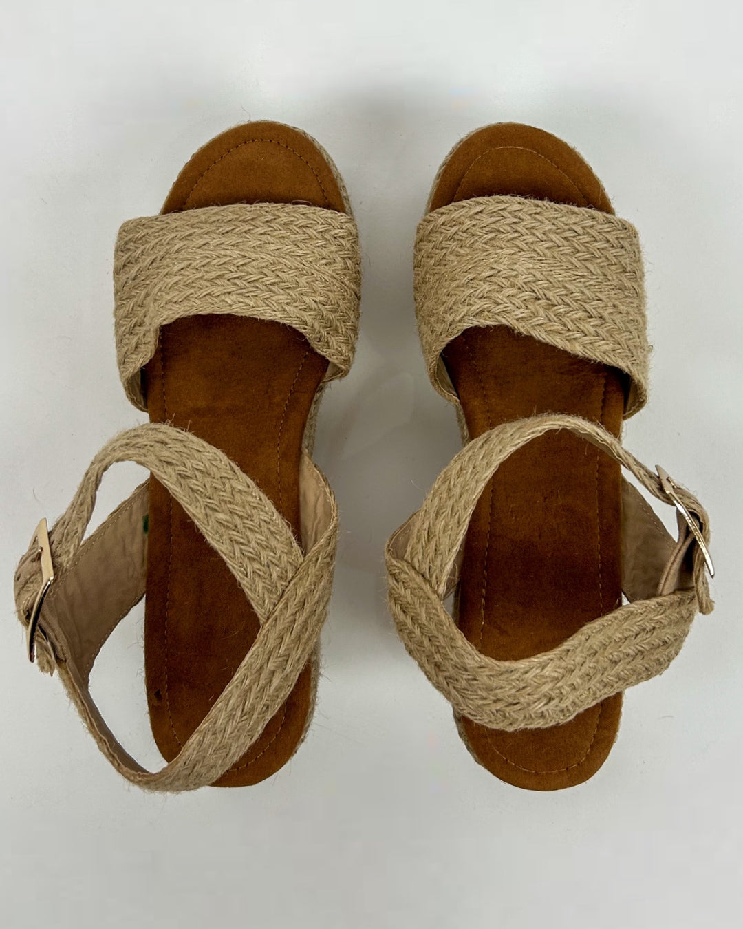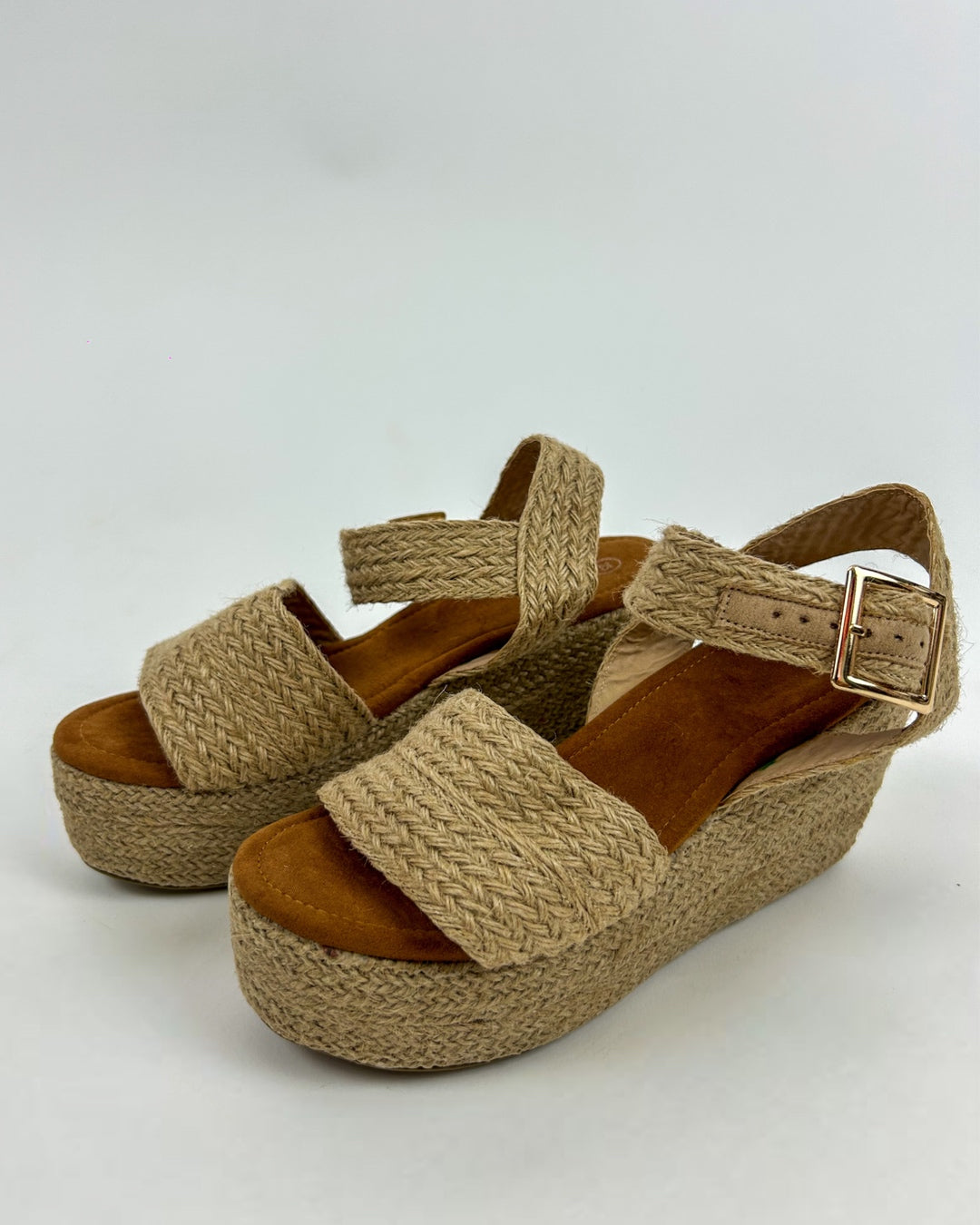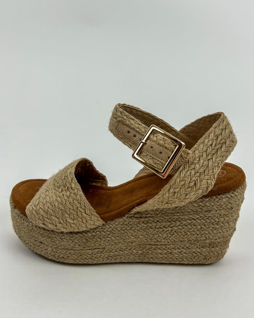 Plataforma forrada en su totalidad de yute natural, una fibra orgánica traída desde Tailandia, todo el proceso de elaboración, desde la fibra, hasta el armado del calzado es artesanal. La plantilla es de gamuza sintética de la mejor calidad, así mismo forramos los cortes del calzado de piel sintética suave y resistente para mayor comodidad en tus pisadas.