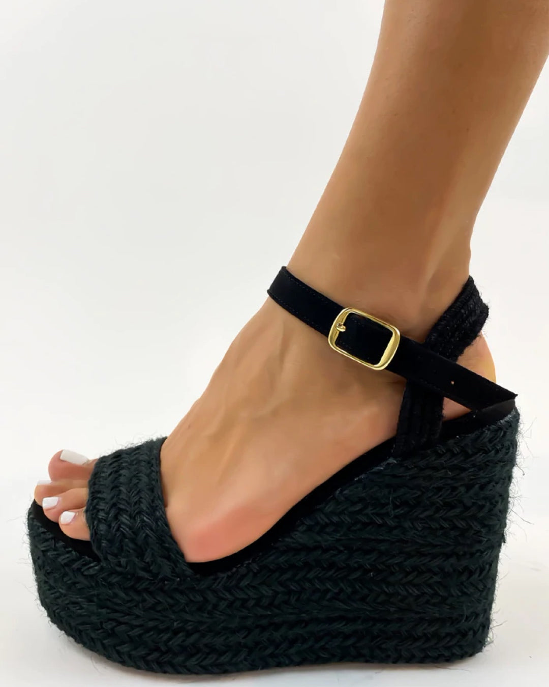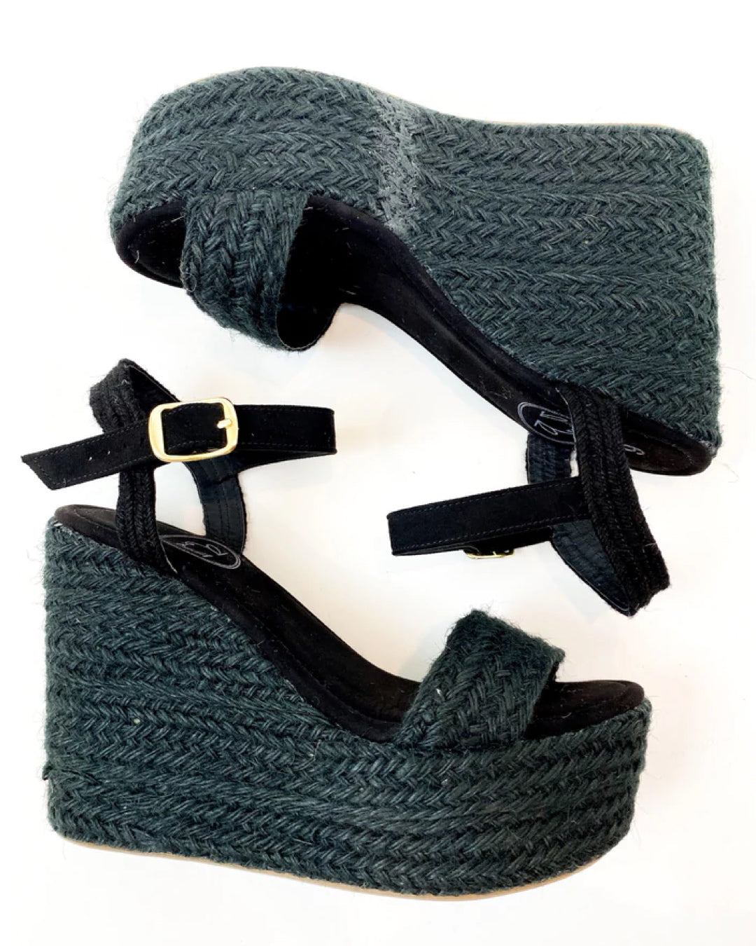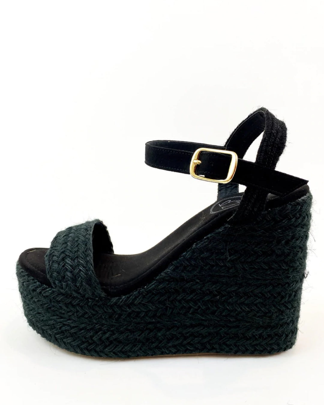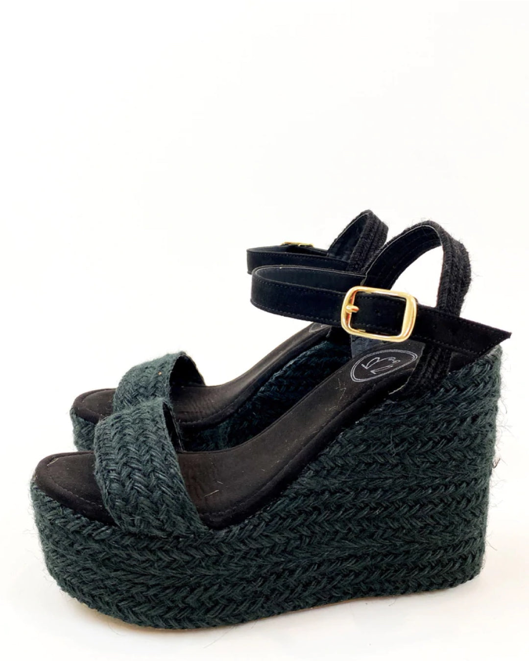 Plataforma forrada en su totalidad de yute natural, una fibra orgánica traída desde Tailandia, todo el proceso de elaboración, desde la fibra, hasta el armado del calzado es artesanal. La plantilla es de gamuza sintética de la mejor calidad, así mismo forramos los cortes del calzado de piel sintética suave y resistente para mayor comodidad en tus pisadas.