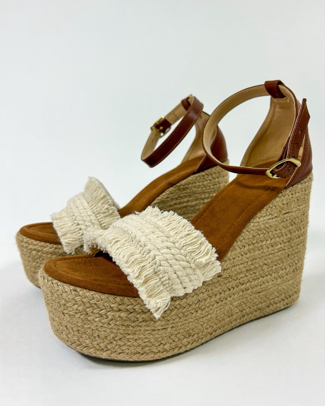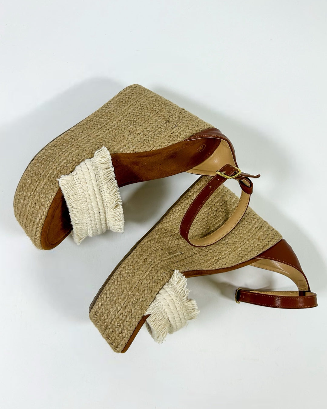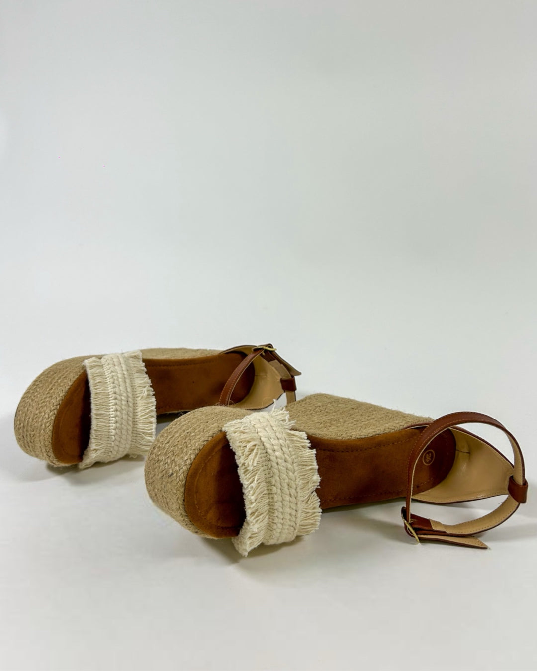 Plataforma forrada en su totalidad de yute natural, una fibra orgánica traída desde Tailandia, todo el proceso de elaboración, desde la fibra, hasta el armado del calzado es artesanal. El corte es de macramé y la plantilla es de gamuza sintética de la mejor calidad, así mismo forramos los cortes del calzado de piel sintética suave y resistente para mayor comodidad en tus pisadas.